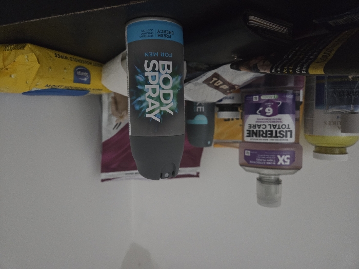 The scene is located in the city of Braine-l'Alleud, Belgium. It depicts an indoor arrangement of personal care and household items positioned on a dark, flat surface against a plain, light-colored wall. In the central foreground, a grey aerosol can of "BODY SPRAY FOR MEN" with "FRESH ENERGY" branding and a blue/green design is prominently displayed. To the left and slightly behind the body spray, a purple bottle of "LISTERINE TOTAL CARE" mouthwash is visible, featuring "5X MORE EFFECTIVE THAN FLOSS" and "6 IN 1 PROTECTION" text. Behind the Listerine bottle, a yellow container, likely a supplement bottle, is partially visible. Further left, a blue container is partially obscured. A dark-colored wallet with some papers or receipts on top rests in the left foreground. To the right of the Listerine, a dark grey/black deodorant container with a light blue accent is present. In the right mid-ground, a yellow package of "Spaargo" brand "HOUSEHOLD WIPES" is visible. Various soft packages and pouches are scattered in the mid-to-background, including a light-colored pouch with "TOP" visible text and a larger magenta-colored bag further back. No individuals are present, and no actions or interactions are occurring.