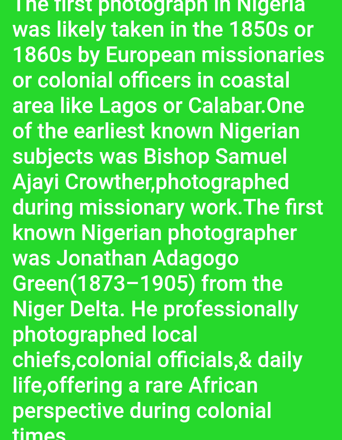 The image is a text document on a green background. The text discusses the history of photography in Nigeria. The text states that the first photographs in Nigeria were likely taken in the 1850s or 1860s by European missionaries or colonial officers in coastal areas like Lagos or Calabar. It mentions that Bishop Samuel Ajayi Crowther was one of the earliest known Nigerian subjects to be photographed during missionary work. The text also states that Jonathan Adagogo Green, a Nigerian photographer from the Niger Delta, was a professional who captured local chiefs, colonial officials, and daily life, providing a unique African perspective during the colonial era. The coordinates provided are not relevant to the image or its content.