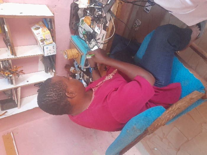An individual is depicted performing electronic repair work within a room in Akwanga, Nigeria