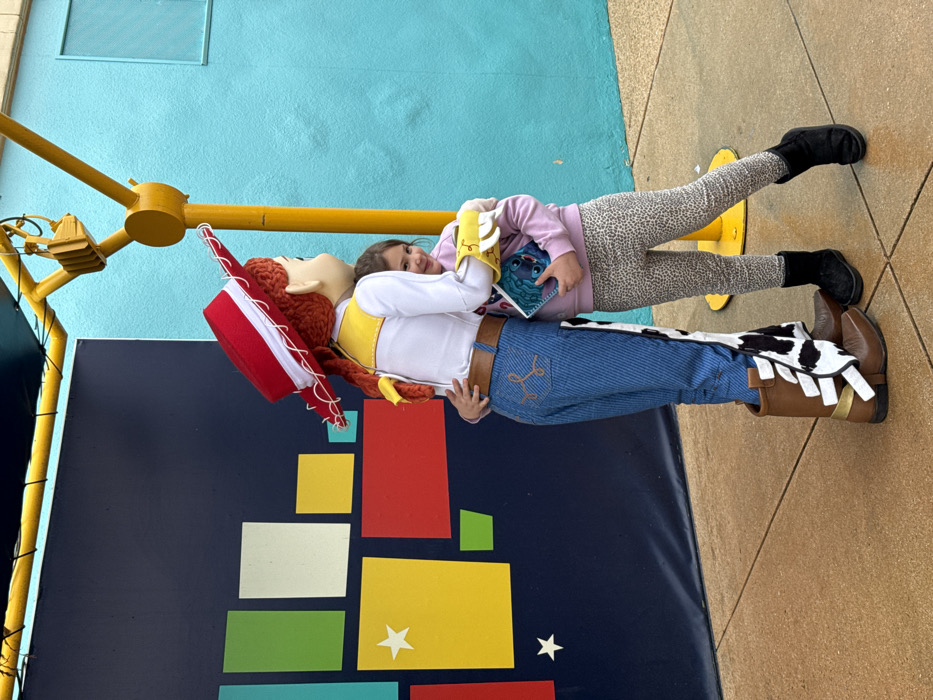 - "An outdoor, eye-level image captures a full-body costumed character dressed as Jessie from Disney/Pixar's Toy Story embracing a young girl" by FM-xTDQG2, licensed under CC BY 4.0