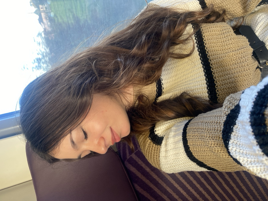 A young female, with long, wavy dark brown hair, is depicted in profile, facing to the right. Her eyes are closed or cast downwards, and a faint smile is present on her lips. She is wearing a chunky knit sweater with horizontal stripes in off-white, beige/tan, and black. A black belt with a gold buckle is visible around her waist on the lower right side of the frame. She is seated within what appears to be a train or bus, leaning against a purple seat with a patterned fabric to her left. Through the window behind her, blurred outdoor scenery is visible, consisting of green land and a distant building with prominent rooflines and dormers, indicative of a large structure or chateau. The scene is illuminated by daylight. This image is situated in the city of Brumath, France.