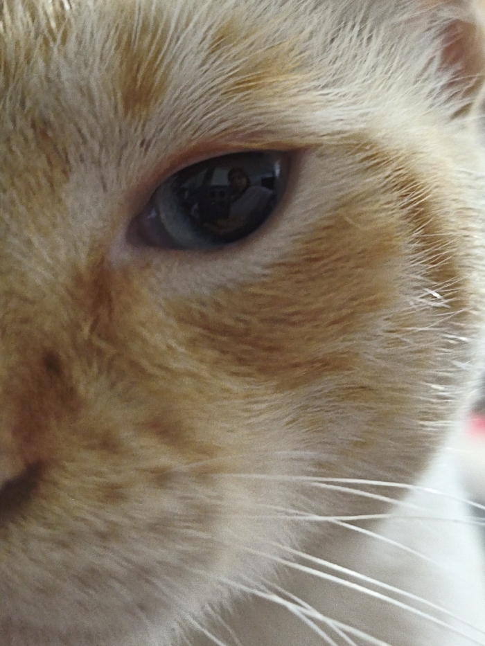 A close-up shot reveals the right eye of a light orange and white cat