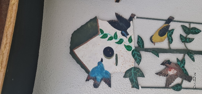 A decorative plaque shows a white birdhouse with a green roof and a round opening