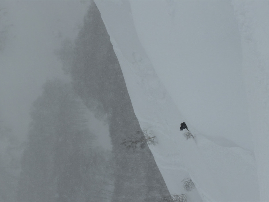 From a high angle, a person, clad in dark attire, is visible on a snow-covered mountain slope. The landscape is heavily obscured by snowfall. Bare trees dot the terrain near the person and along the left edge, where the slope transitions to a darker, potentially wooded area. The scene conveys a sense of isolation amid the winter weather.