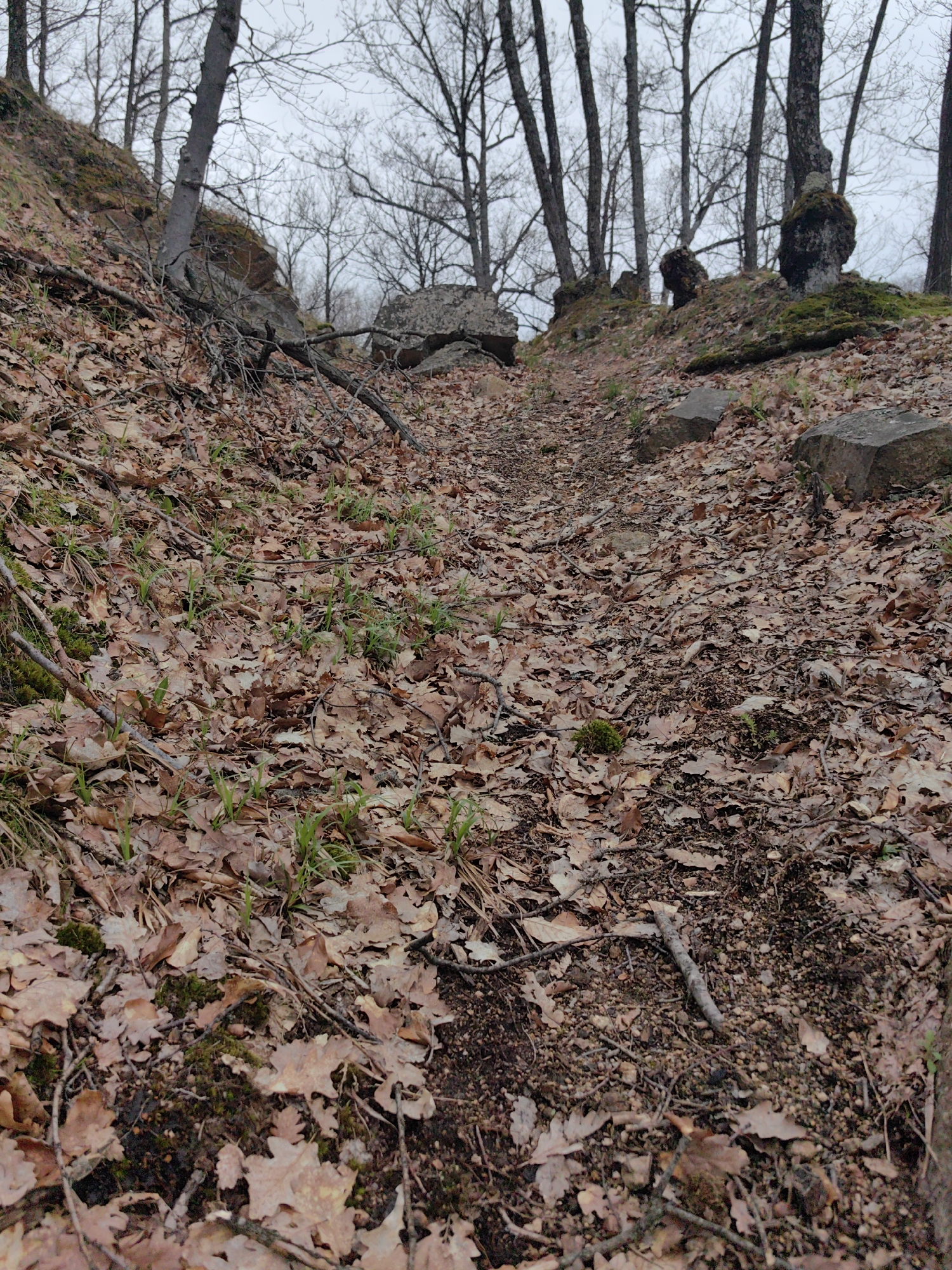 The image depicts a wooded area with a path covered in fallen leaves. Bare trees are visible along the sides of the path and on a slightly elevated area in the background. The ground is covered with brown leaves and small twigs. In the middle of the frame, there is emerging green grass, suggesting the beginning of spring. In the background, several large boulders are visible. The sky is overcast. The location is speculated to be a forested region in Slatina, Bulgaria. No people or animals are present in the image.