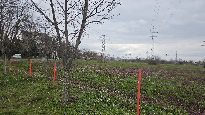 The image displays an expansive undeveloped lot within the city of Stara Zagora, Bulgaria, under an overcast sky. The foreground is dominated by a field covered in green vegetation interspersed with widespread patches of small purple and white flowering plants. Three orange-red marker poles are vertically inserted into the ground, two on the left and one on the right, suggesting boundary or survey points. Two leafless deciduous trees stand prominently in the foreground and midground. In the mid-distance on the left, a white van is parked on what appears to be a paved or unpaved road, with a multi-story, grey-toned building visible behind bare trees. The background features a series of high-voltage electrical transmission towers, characterized by their metal lattice structures, extending horizontally across the landscape, connected by visible overhead power lines. Additional sparse, bare trees and shrubs are scattered throughout the midground and background. No individuals or animals are present.