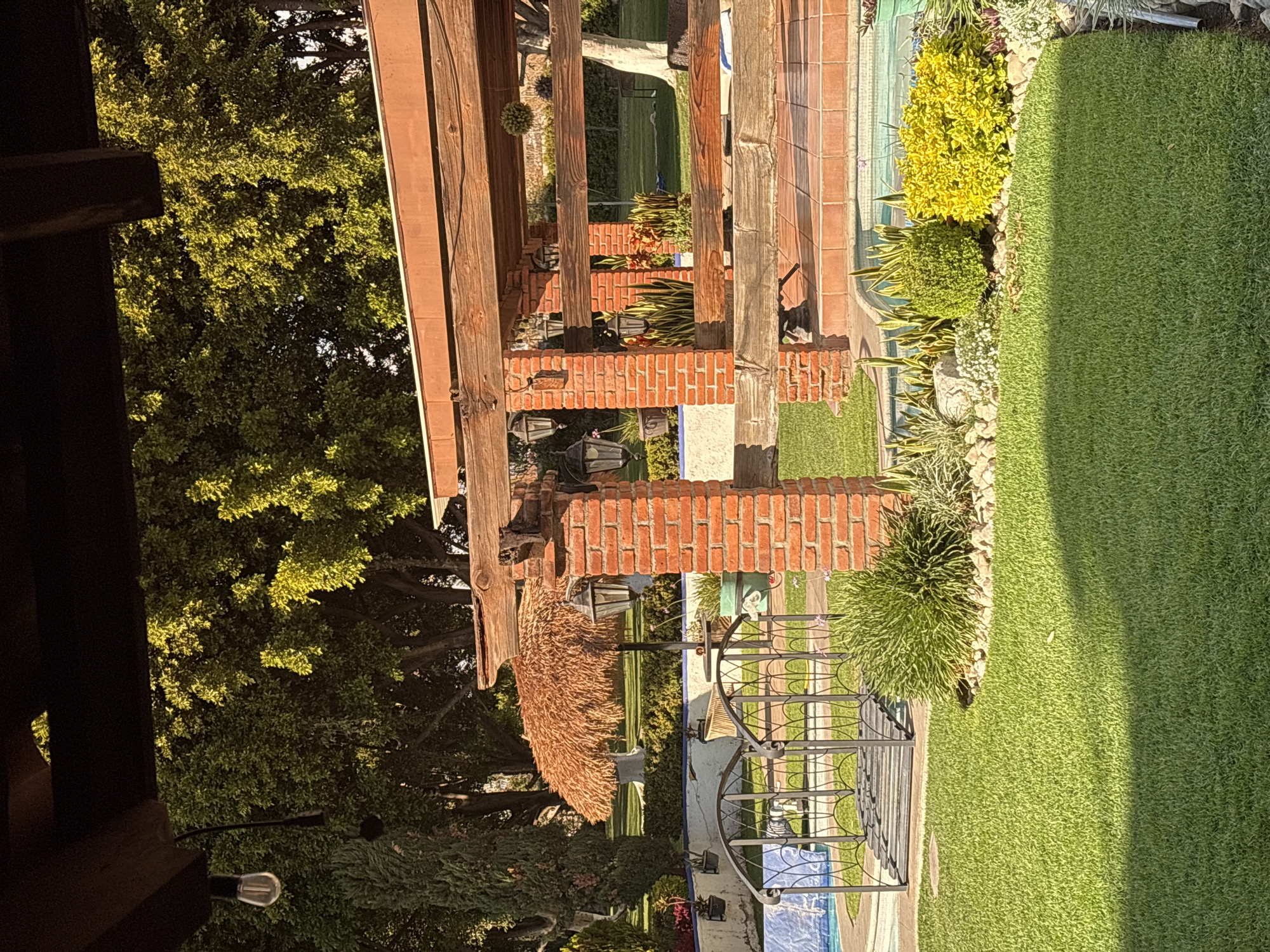 The scene is a residential outdoor area, likely a backyard, featuring a lawn, pool, and brick pergola