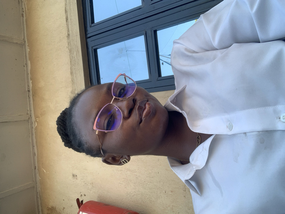 The image captures a young Black female subject positioned against a textured, light-colored wall, identified as being in Tempure, Nigeria. She wears a white collared shirt, a gold necklace with a "CD"-like pendant, and a small, round gold earring on her visible left ear. Her hair is braided and styled upward. She is looking towards the viewer with a slight smirk, wearing pink and gold-framed glasses with blue-tinted lenses. To the left of the subject, a red fire extinguisher is mounted on the wall. To her right, a dark-framed window or glass-paneled door reflects a blue sky and distant structures. The scene is illuminated by natural daylight.