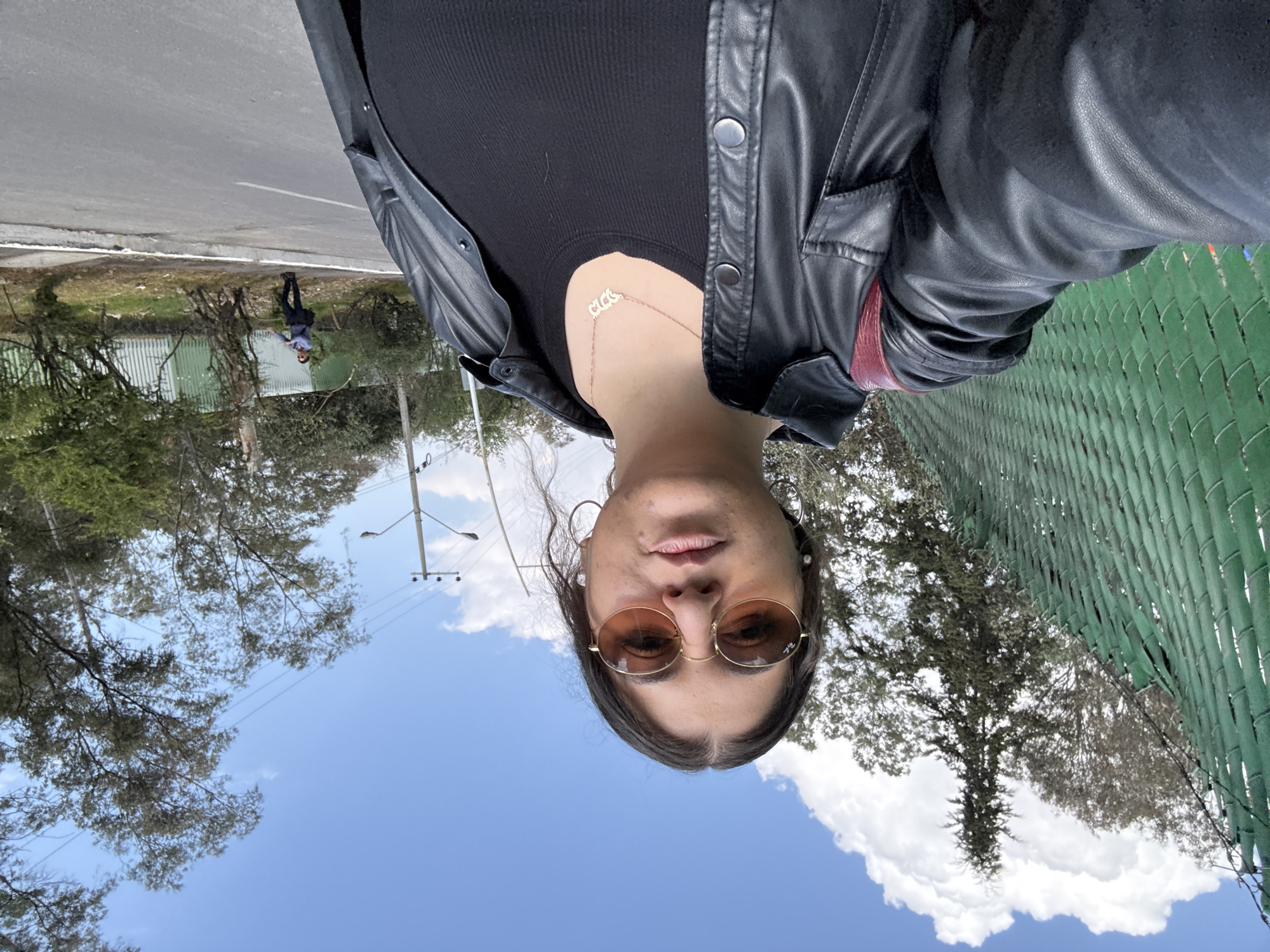 selfie taken outdoors. The main subject is wearing sunglasses, a black top, and a black leather jacket with a name necklace. The background includes trees, a blue sky with clouds, a street, and a green fence. There is a person walking in the distance. Based on the environment, it is likely the location is in Mexico City, Mexico.