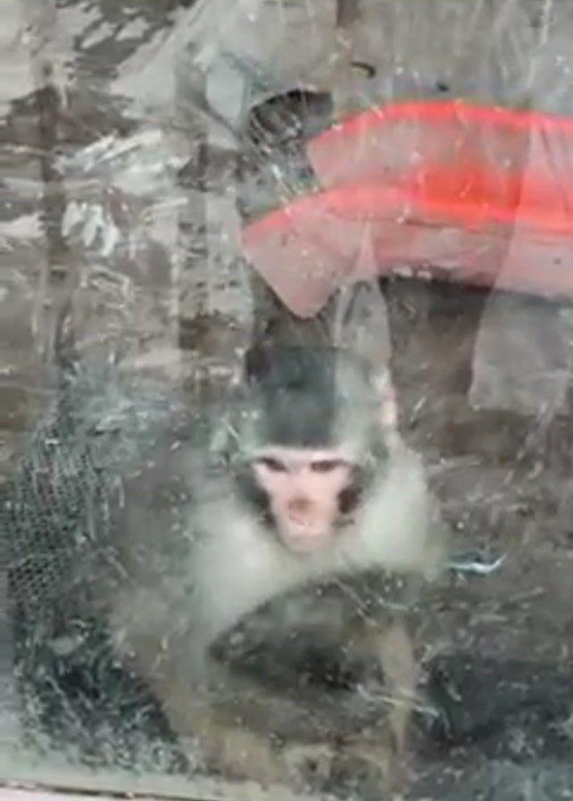 monkey inside a dirty enclosure, looking out at the viewer. The enclosure has dirty glass and some objects visible inside with the monkey. The camera moves slightly, showing more of the enclosure. A person is speaking in the background.