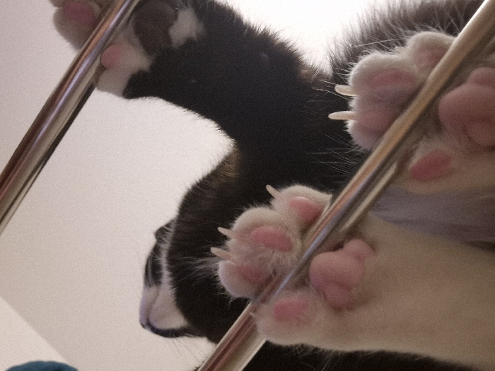 - "A black and white cat grips shiny metal bars with extended claws and pink toe beans" by FM-DaNa73, licensed under CC BY 4.0