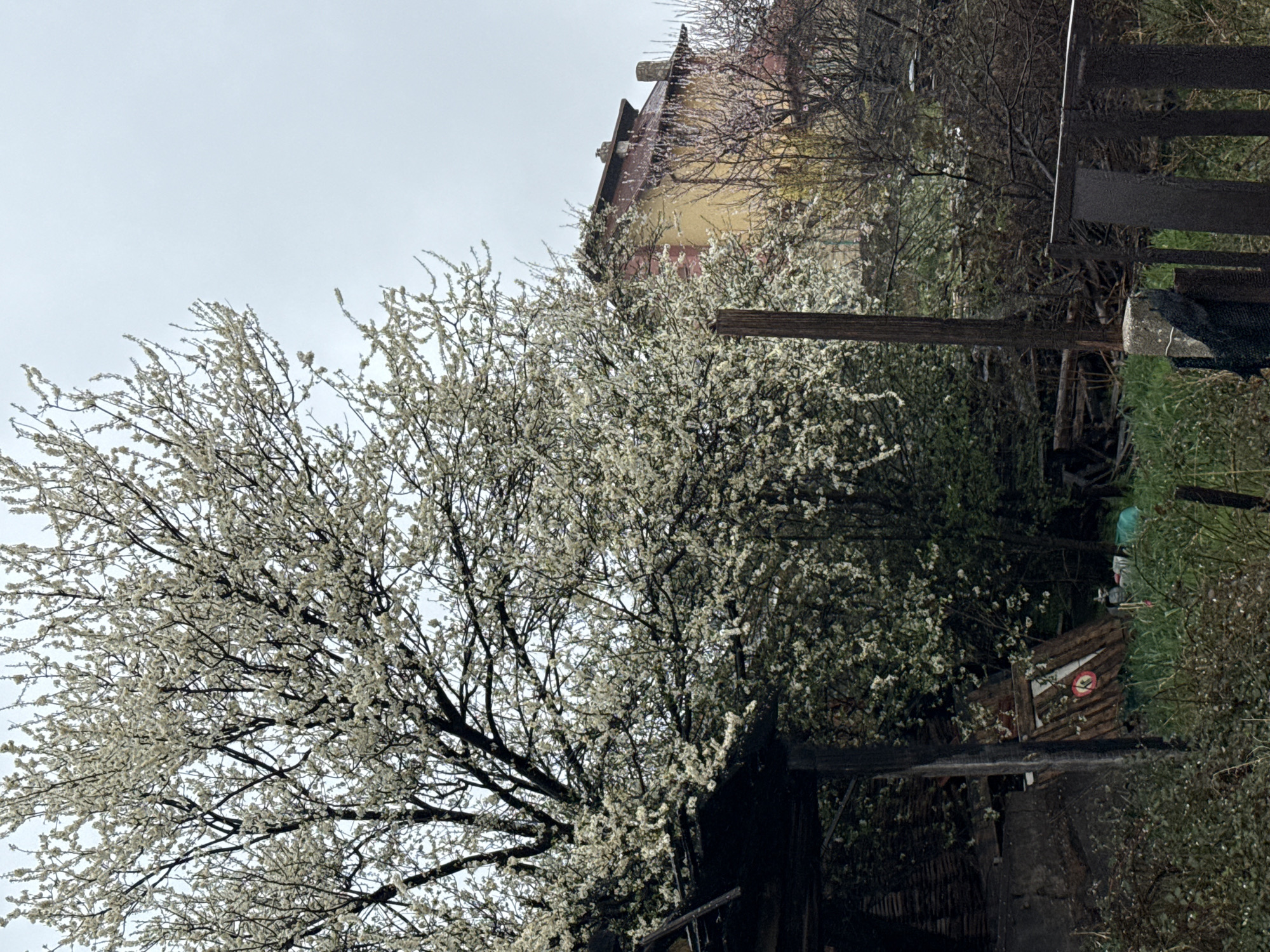 view in Radilovo, Bulgaria, featuring a flowering tree in the foreground. The tree has numerous small white blossoms. Behind the tree, a two-story building with a yellow facade and a red roof is visible. To the right of the tree is an overgrown area with a wooden fence and various objects, including a sign with a bird on it. The sky is overcast. The overall impression is of a springtime scene in a rural or suburban setting.
