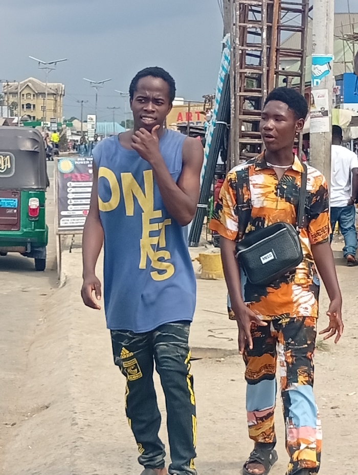 The image displays two males walking on an unpaved street in Aba, Nigeria, under an overcast sky
