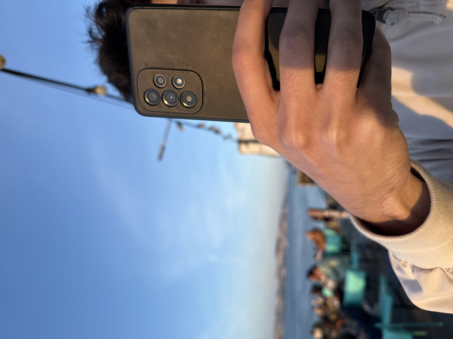 The image displays an outdoor scene in Almada, Portugal, specifically a waterfront establishment along the Tagus River, with a view towards Lisbon, captured during late afternoon or early evening. The central subject is a person's right hand holding a dark-colored smartphone vertically, obscuring most of their face. Only the top of the person's dark, curly hair and a portion of their right ear are visible behind the phone. The smartphone's rear features a prominent camera module with four circular lenses arranged in a vertical block and an additional flash module. The hand exhibits fair skin with visible hair on the forearm and is illuminated by warm, directional sunlight, casting clear shadows. The person is wearing a light-colored, long-sleeved garment with a ribbed cuff, likely a jacket or sweatshirt. In the blurred mid-ground and background, an outdoor seating area is visible with several indistinct figures of people seated on turquoise-colored chairs and at tables. Beyond this area, the wide expanse of the Tagus River stretches towards the horizon, with the hazy cityscape of Lisbon discernible on the opposite bank. Faint outlines of boats or structures are present on the water. Overhead, a string of decorative lights with individual bulbs is strung diagonally across the frame. In the far background, a large construction crane is visible against a clear, blue sky with a subtle atmospheric haze.