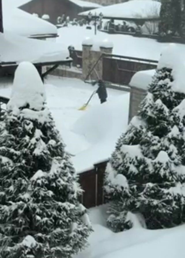 A person is shoveling snow in a backyard covered in a thick layer of snow. The individual, dressed in dark clothing, uses a yellow shovel to clear a path in the snowy yard. In the foreground, two snow-covered evergreen trees frame the scene. The backyard is fenced in, with a gate visible. Beyond the fence, rooftops of neighboring buildings are also covered in snow, suggesting a heavy snowfall has occurred. The overall lighting is subdued, indicating an overcast or snowy day.