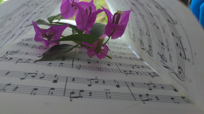 - "An image captured in Longuo 'A', Tanzania, depicts a cluster of five vibrant purple bougainvillea flowers with green foliage resting upon an open, light-colored sheet music book" by FM-QrecA3, licensed under CC BY 4.0