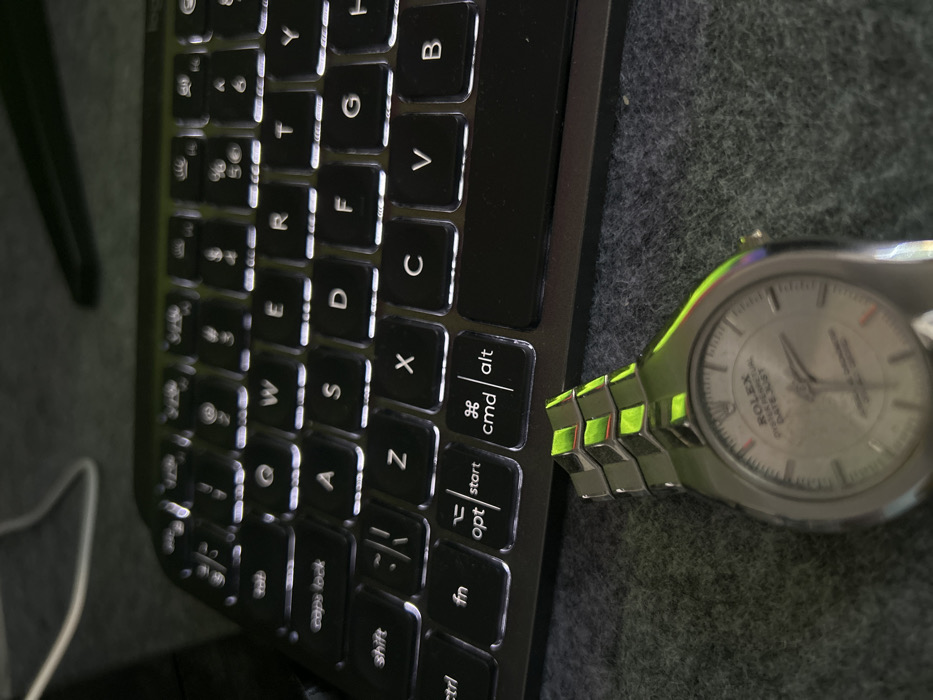 An indoor scene in Voluyak, Bulgaria, displays a silver-toned metallic wristwatch positioned in the foreground on a dark grey, textured surface. The watch features a light-colored dial with "ROLEX OYSTER PERPETUAL DATE-JUST OFFICIALLY CERTIFIED CHRONOMETER" inscribed. Its metal bracelet exhibits a distinct stepped design, reflecting a prominent greenish-yellow light. Directly behind and partially obscured by the watch, a dark computer keyboard with illuminated white characters is visible, slightly out of focus. The keyboard presents a QWERTY layout, with keys such as 'caps lock', 'shift', 'ctrl', 'fn', 'opt', 'start', 'cmd', and 'alt' clearly legible. No individuals are present in the image. The environment is dimly lit, with artificial light sources illuminating the keyboard and reflecting off the watch.
