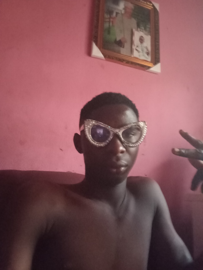 A shirtless person with dark skin poses indoors, wearing rhinestone-studded, cat-eye glasses. A pink wall provides the backdrop. Above and behind the person is a framed picture featuring two men, one older than the other, presumably family. The person's right hand is raised, fingers slightly separated. The overall lighting is subdued.