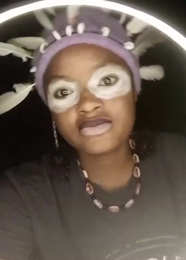A woman wearing an elaborate headpiece and makeup stands in front of a ring light. The headpiece appears to be a purple knitted band adorned with white feathers and small white objects. The makeup includes white paint around the eyes and on the lips. She wears a dark gray T-shirt with a partial white logo that reads "MONCLER." She is also wearing a necklace of what appears to be light pink and brown beads. The background is dark. The woman looks directly at the camera.
