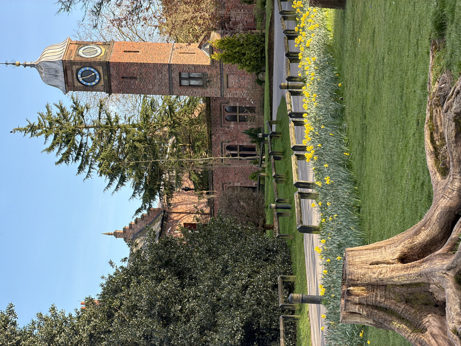 The image depicts a meticulously maintained section of Walton Hall and Gardens in Warrington, United Kingdom, under clear blue skies. In the mid-ground to the right, a prominent red brick clock tower rises, capped with a light-colored, domed cupola and a finial. The visible clock face is circular with a dark blue background, light blue Roman numerals, and gold hands. Below the clock face, two rectangular windows with dark frames are visible. To the left and behind the clock tower, a large, historic-style building constructed of reddish-brown brick is visible. This structure features multiple stepped gables and arched windows. A tall, dark green coniferous tree stands directly behind the clock tower, while other deciduous trees with bare branches are scattered throughout the background. In the foreground, a large, weathered tree stump with exposed root systems occupies the lower left. A vibrant band of yellow daffodils is in full bloom across the mid-ground, bordering a paved pathway or roadway. This pathway is delineated by a series of approximately twenty wooden bollards or low barriers with squared tops, some darker and some lighter in color, positioned along its edge. The foreground and areas surrounding the pathway are covered with neatly mown green grass. Sunlight illuminates the scene from the right, creating defined shadows, particularly on the buildings and the tree stump. No individuals or overt activity are present.