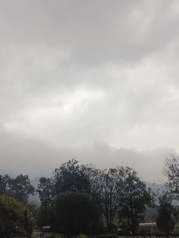 Gloomy overcast sky fills the frame. Layers of dense clouds create a uniform, diffused light. Below, trees with dark silhouettes define the horizon. Hints of hills and possibly mountains are obscured by the heavy fog. The scene is muted and somber, conveying a sense of stillness and quiet.