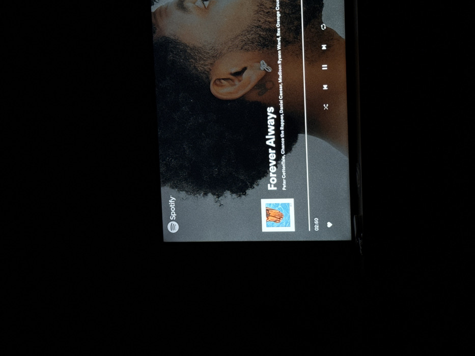 The scene depicts a digital display, likely a television or monitor, operating within a dark room in the city of Zibatá, Mexico. The screen shows the Spotify music streaming interface. In the upper left corner, the Spotify logo is visible. The displayed track is "Forever Always," attributed to Peter CottonTale, Chance the Rapper, Daniel Caesar, Madison Ryann Ward, and Rex Orange County. The album art features a square image with an orange element against a blue background. The song's current playback position is 02:50, indicated by a timestamp and a progress bar. Playback controls, including shuffle, previous track, a pause icon (indicating active playback), next track, and repeat, are visible along the bottom of the screen, accompanied by a heart icon. The background visual for the song displays a close-up profile of a person with dark, curly hair and a beard, facing right. An ornate earring is visible in their ear, and a tattoo is discernible on their neck behind the ear. The surrounding physical environment outside the screen is obscured by darkness.