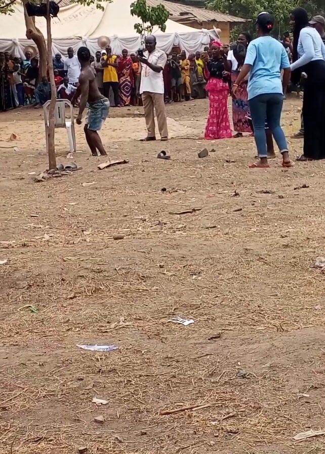 man dancing in a dusty, open area, possibly at a celebration or event. A small audience watches from the background, including a few people standing closer to the dancer, some with phones or cameras. There's a tent in the background, and some kind of wooden structure with a chair tied to it in the foreground. The dancer wears shorts, while the spectators wear a variety of casual and formal clothing. Another man passes between the dancer and the camera, also appearing to enjoy the music.