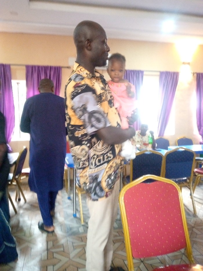 An indoor scene in Orlu, Nigeria, depicts an adult male holding a baby