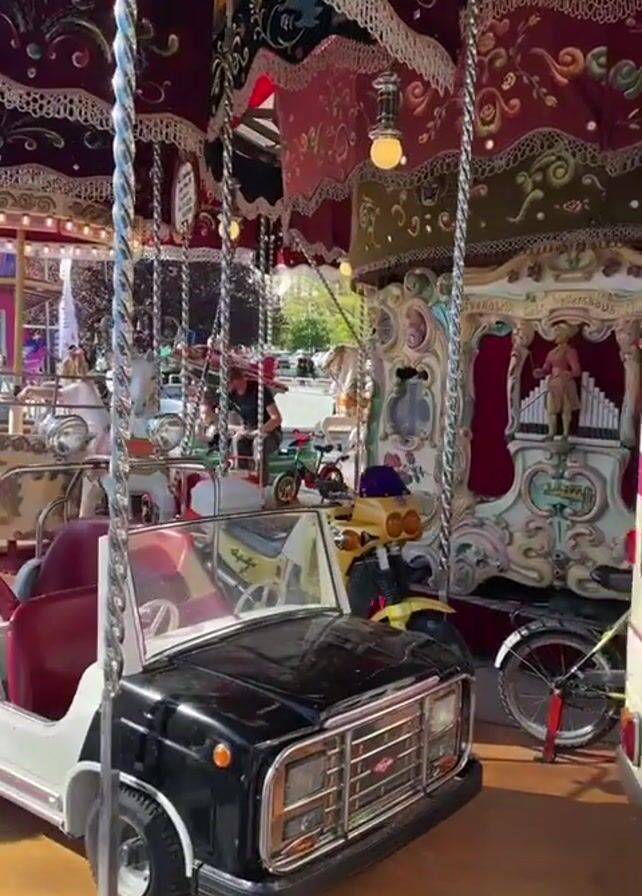 The camera pans across a colorful carousel that is parked outside
