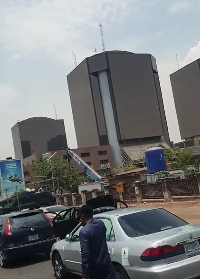 city street scene with a couple of large, modern buildings in the background. These buildings are gray with a light gray vertical stripe in the middle. There is a blue crane partially visible behind a fence in front of the buildings, along with a blue water tank. Several cars are parked along the street. People can be seen walking on the sidewalk and near the cars. A black police vehicle with the words "RIVERS STATE POLICE FORCE" printed on it is also visible in the background. A "NO PARKING" sign is seen on the right side of the frame. The sky is partially cloudy. Overall, the scene depicts a normal day in a city with governmental or commercial buildings.