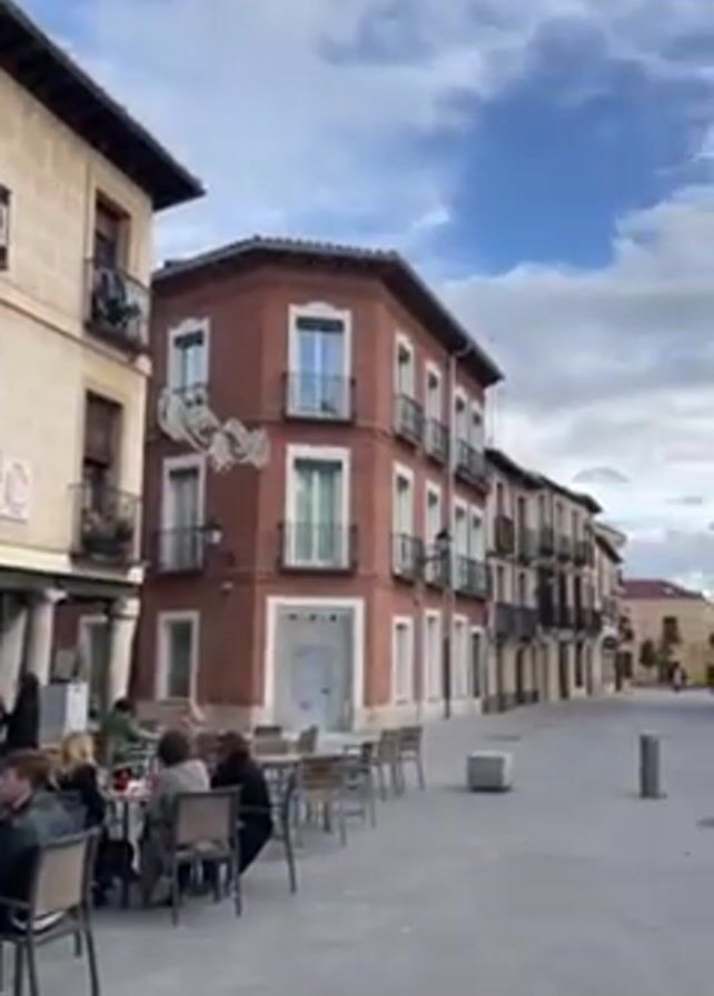 The camera pans slowly across a European town square on an overcast day. Several people sit at tables outside a restaurant under a building with a Spanish flag hanging from a balcony. The camera then pans to show other buildings around the square, ending on a large, white church with a tall steeple, a sculpture, and a police car parked nearby.