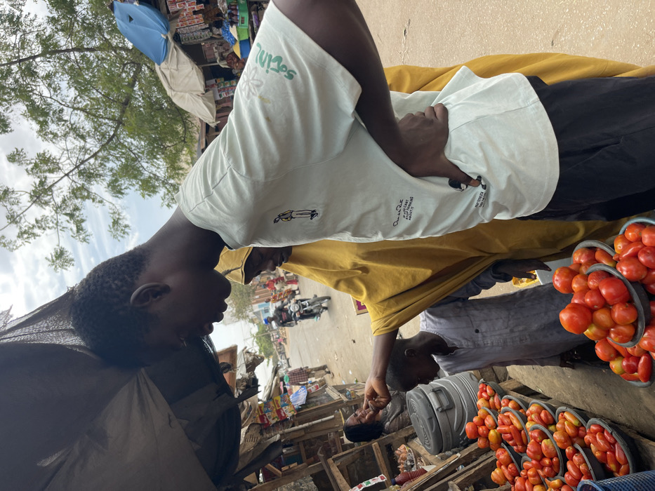 The image depicts an active street market in Zaria, Nigeria. In the immediate foreground, a dark-skinned male, approximately adolescent, with short dark hair, wears a light-colored, short-sleeved t-shirt featuring graphic designs, standing with his hands on his hips and his head bowed, looking left. Behind him, an individual in a yellow robe extends their right arm forward, pointing or touching an item at a stall. A younger child in a light grey garment stands near the individual in yellow, observing. To the left, a wooden market stall displays numerous small black bowls filled with red tomatoes, arranged in tiers. A smiling woman is partially visible behind this stall. In the background, a dirt road is visible, extending into the distance, lined with various market stalls, buildings, and other people, including one individual on a motorcycle. Overhead, a bright, partially cloudy sky is visible, along with sparse tree foliage.