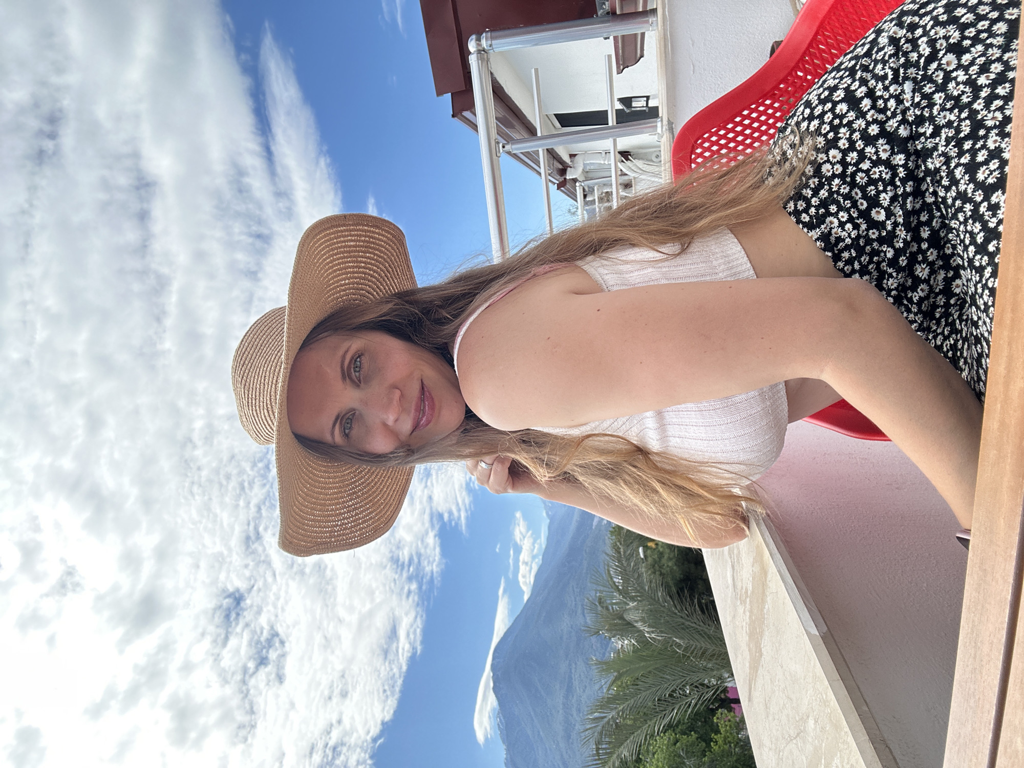 A woman wearing a straw hat, a white top, and a black and white floral print skirt is on a balcony in Fethiye, Turkey. She is leaning against the balcony railing, with a red plastic chair behind her. In the background, there are trees and a mountain range. The sky is blue with white clouds.