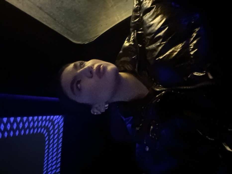 A person wearing a shiny jacket looks up, as seen from a low angle. A surface is above them, possibly a ceiling. To their left, a dark panel is illuminated with a pattern of blue diamonds within a border. The lighting is dim, emphasizing the texture and reflections of the jacket and the person's face. They are wearing prominent earrings.