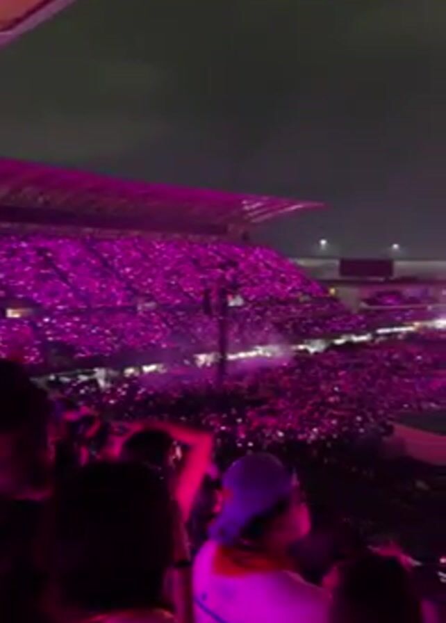 large crowd of people at a concert in a stadium at night. The stadium is packed with people, and the entire scene is illuminated in bright purple light. Many people in the crowd are holding up their phones, presumably to record the concert. In the foreground, the backs of the heads of several people are visible, suggesting the video is being recorded from within the crowd. The sky is dark and cloudy, and there are some distant lights visible beyond the stadium. The stage is visible in the distance, emitting a strong purple glow and some smoke.