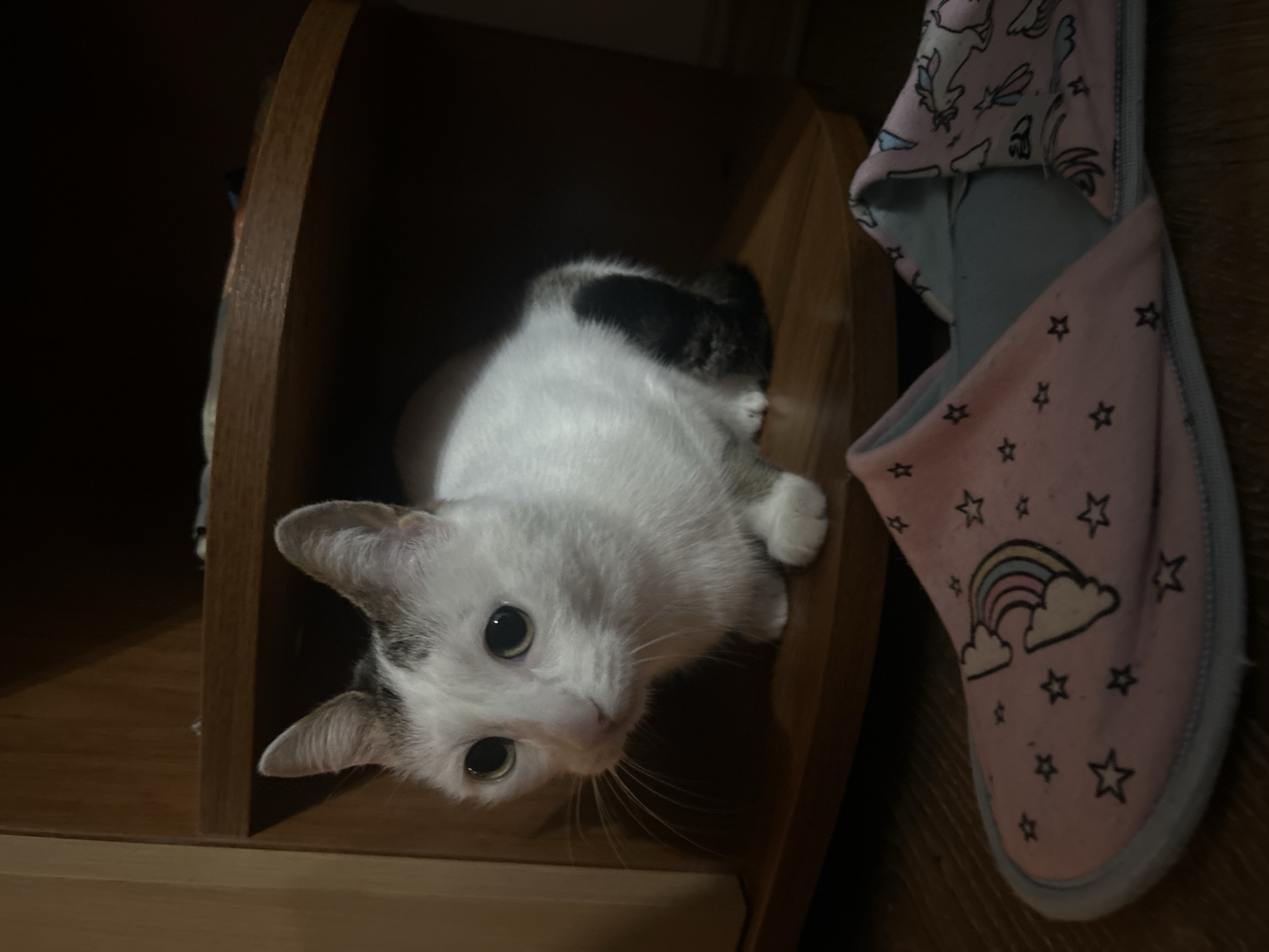 A white cat with black spots sits within a wooden structure, its wide eyes looking up. Next to the cat is a pink slipper adorned with a rainbow and stars. The slipper's lining is light blue and shows a pattern of unicorns. The wooden structure appears to be part of a shelf. The scene is dimly lit, creating shadows within the wooden enclosure and emphasizing the cat's curious gaze.