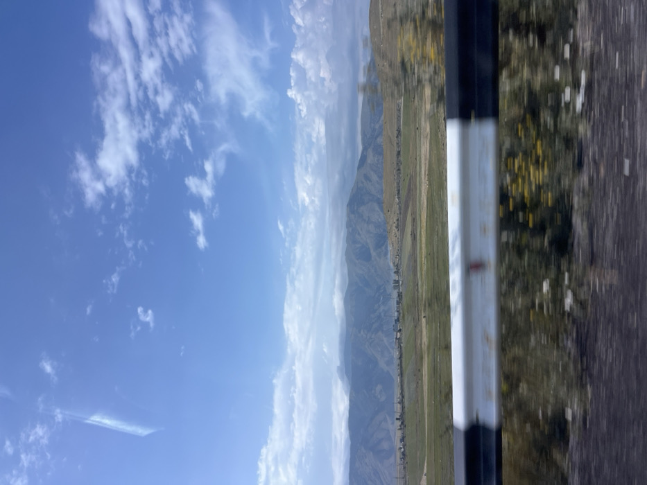 A landscape photograph shows a bright blue sky with scattered white clouds. Below, a mountain range is shrouded in a light haze. Adjacent to the mountains, a flat, grassy plain stretches out. Close to the viewer, blurred elements suggest movement, possibly from a vehicle. These blurred objects appear to be roadside fixtures like posts or barriers.