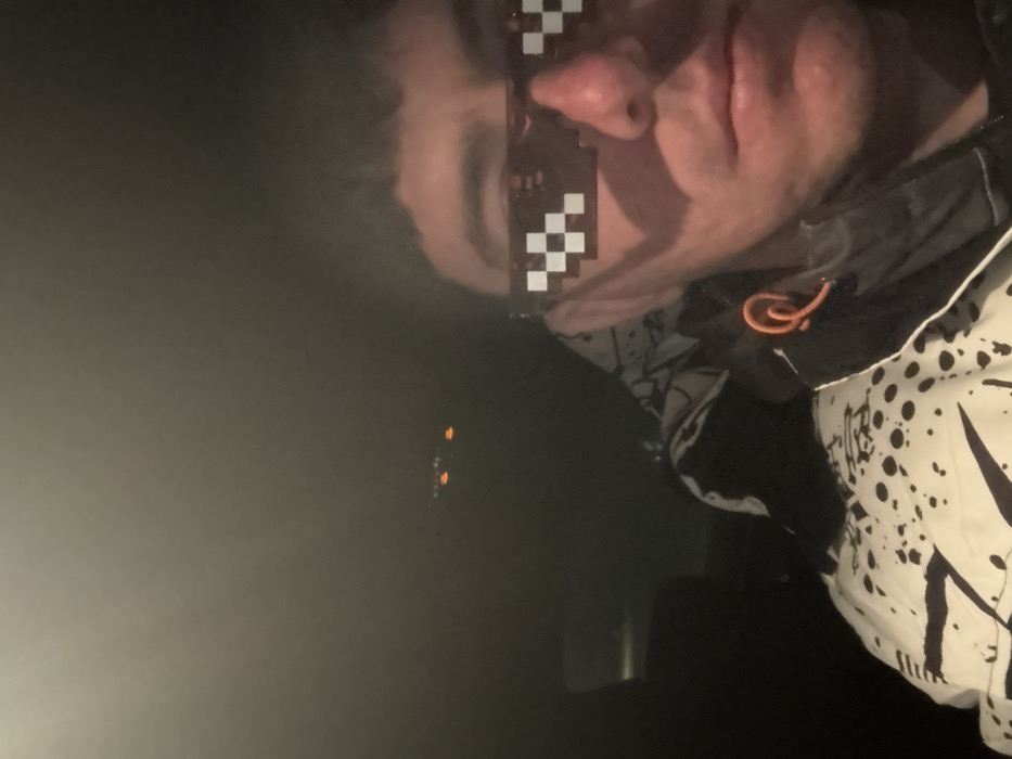 The image depicts the interior of a vehicle during low-light conditions, likely at night. A single male individual is prominently featured, positioned to the right of the frame, facing forward. He has short, dark hair and is wearing black pixelated sunglasses that obscure his eyes. His nose, mouth, and lower face, showing some stubble, are visible. He wears a dark hooded garment layered over or featuring a white section with black splatter or dot patterns. An orange cord or toggle is visible near his right shoulder. In the dim background, to the upper left, two small orange lights are visible within the vehicle's interior. The specific location within Dobrich, Bulgaria, cannot be determined from the visual information provided in the image.