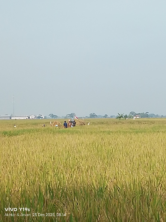 A vast, golden rice field dominates the foreground, with stalks reaching towards the sky. In the distance, a group of people work amongst haystacks. A tractor is visible in the middle of the field. Behind the workers, a distant skyline is punctuated by a tower and scattered buildings. The sky above is pale blue. The scene conveys a sense of rural life and agricultural activity. "VIVO Y19s Akhtar & Arvan 25 Des 2025, 08.14" is written in the left corner of the photo.