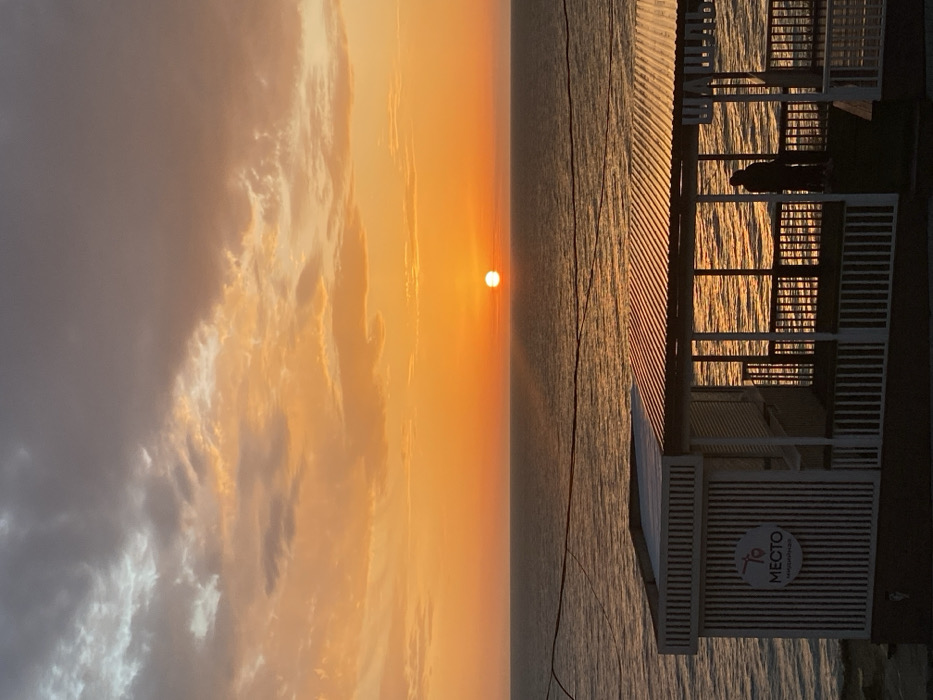The image depicts a sunset over the Black Sea, observed from the coastal area of Anapa, Russia