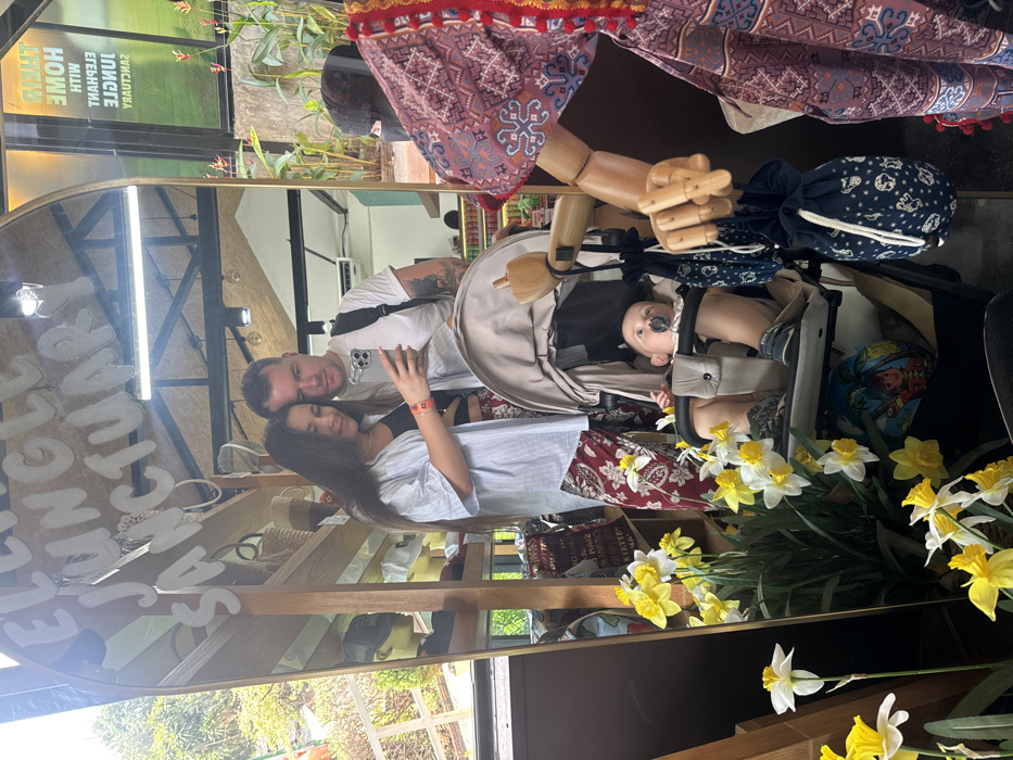 A reflection shows a couple taking a selfie in front of a mirror. A baby reclines in a stroller, positioned to the right of the couple, and beside them is a bouquet of yellow and white daffodils. A mannequin arm holds the stroller handle, and a piece of ornate fabric is draped above it. The mirror reflects a shelf stocked with various goods, and the exterior shows trees and sky.