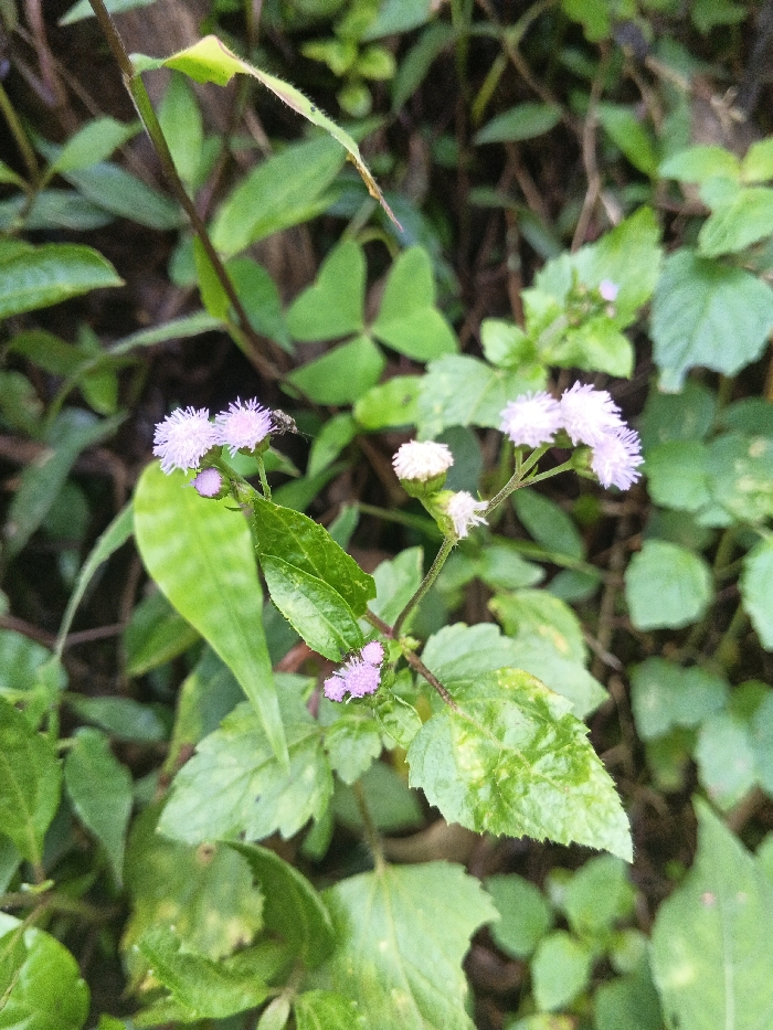 A cluster of small, light purple flowers with fluffy petals grows amongst lush green foliage. Several blossoms are fully open, while others appear as unopened buds. A tiny fly rests on one of the flowers. The leaves surrounding the flowers are varied, some exhibiting smooth edges and a healthy green color, while others display signs of insect damage or yellowing patches. The background is a dense mix of other green plants, creating a natural and vibrant scene.