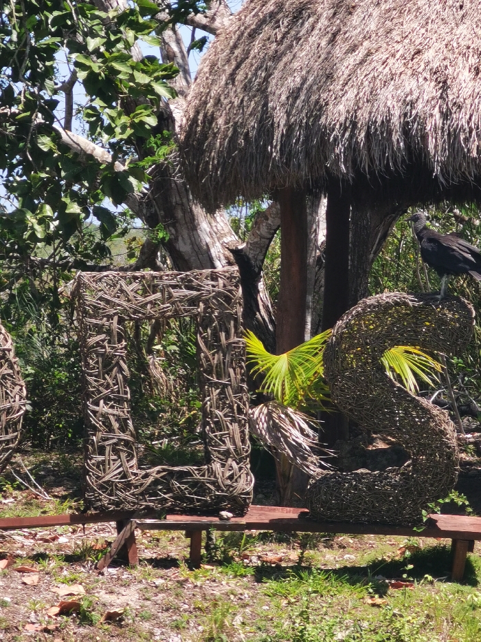 large, woven wicker structure that appears to be the letters "U" and "S" in front of a thatched-roof hut in Unidad de Riego, Mexico. The structure is made of natural branches woven together. A single black bird is perched on the "S" and a small palm tree is growing near the bottom of the "U." There is a wooden bench in front of the structure and dense foliage fills the background. The scene appears to be in a secluded, outdoor area.
