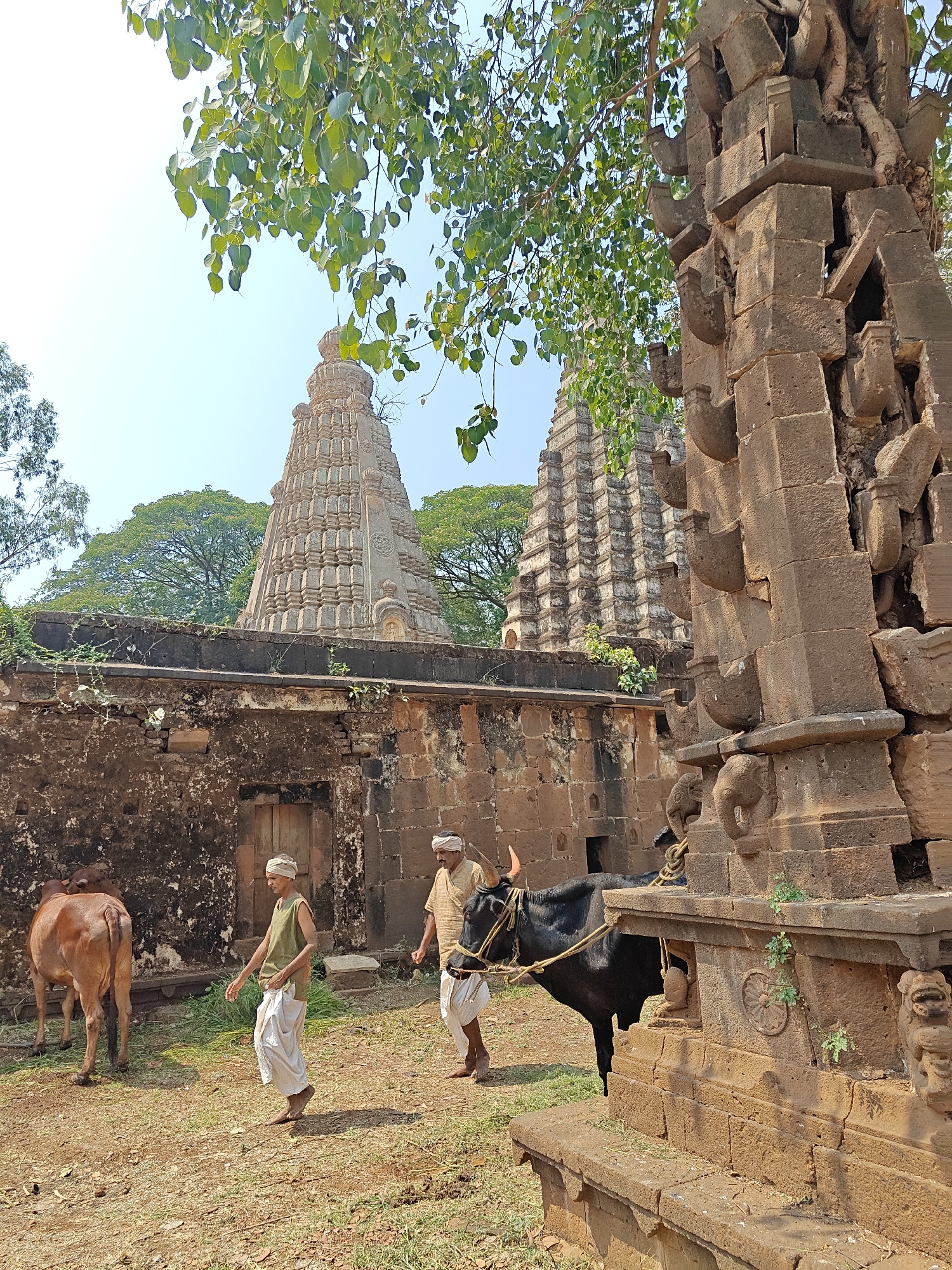 The image depicts an outdoor scene within a historic temple complex in Kolhapur, India. The setting is characterized by bright daylight and clear skies. In the immediate foreground, to the right, a heavily weathered, dark stone architectural structure or column stands, exhibiting intricate carvings including elephant heads and geometric patterns. This structure shows signs of age and partial disintegration, with vegetation and tree roots growing within and around it. The ground in the foreground and midground consists of dry, reddish-brown soil with sparse patches of green grass. In the midground, moving from left to right, a light brown cow or calf is visible from the rear, walking towards the left. Following this animal, an adult male, barefoot and wearing a light green sleeveless top, white dhoti, and a white head covering, walks towards the right. To his right, another adult male, dressed in a light brown patterned shirt, white dhoti, and a white head covering, leads a dark, horned bull by a rope. The bull is positioned near the intricate stone structure on the right. Behind the individuals and cattle, a dark, aged stone wall stretches across the scene, featuring an old wooden door on its left side. Above this wall, in the background, two prominent, light-colored stone temple shikharas (spires) with tiered, conical designs rise against the sky. These structures are partially obscured by lush green trees, which also extend above and behind them. A large tree with vibrant green leaves overhangs the top right of the frame, partially shading the scene.
