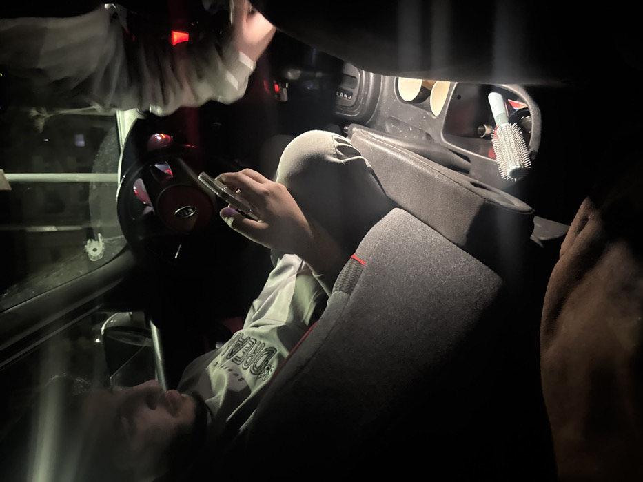 Inside a dark car, a person in a light gray sweatshirt and gray pants sits in the driver's seat, holding a phone. Another person's hand is visible near the steering wheel. The car's interior features gray seats with red accents, a center console with cup holders, and a hairbrush. The scene is dimly lit, with light reflecting off the windshield and phone screen.