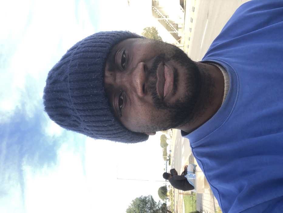 An outdoor scene in النعيلة, Saudi Arabia, captured from a low-angle perspective under a partly cloudy blue sky. The foreground features a male with dark skin, a beard, and a mustache, wearing a dark blue knit beanie and a blue crew-neck sweatshirt over a lighter undershirt, looking directly at the camera. In the mid-ground, to the left, two other males with dark skin are seated on a light-colored concrete bench. One is dressed in a dark long-sleeved shirt and pants, while the other wears white attire; both are hunched forward. A large clear plastic water bottle with a blue cap is positioned on the bench near them. Behind the bench, an asphalt road with a white solid line and black traffic delimiters extends across the frame. A light pole is visible on the left side of the road. In the far background, on the right, a multi-tiered light-colored structure, resembling bleachers, is present.