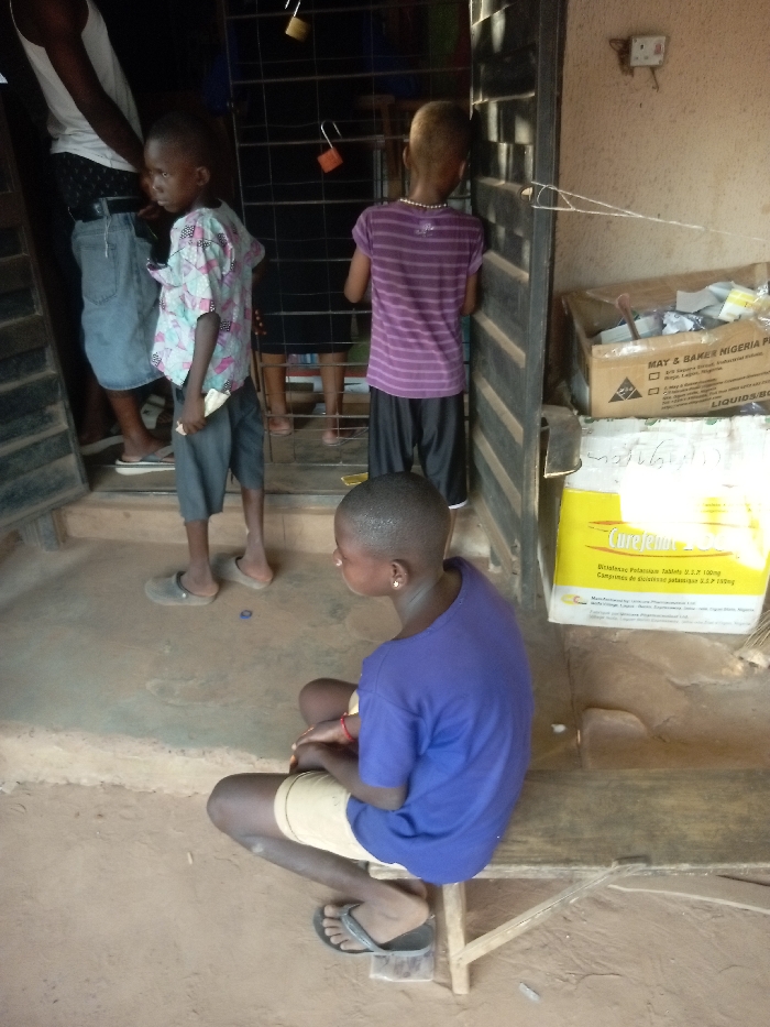 The image depicts an outdoor or semi-sheltered area in Igbenu, Nigeria, showing a group of individuals in the vicinity of a building entrance. In the foreground, a young child with a short haircut, wearing a blue t-shirt, tan shorts, and black flip-flops, sits on a small wooden stool, facing right. A small gold-colored earring is visible in their left ear. In the mid-ground, slightly to the left, another child with a short haircut stands, wearing a patterned short-sleeved shirt, dark shorts, and dark clogs. This child holds a light-colored object, possibly money or paper, in their left hand and looks towards the left side of the frame. To their right, a third child stands with their back mostly to the camera, facing into a darker interior space. This child wears a purple striped t-shirt, dark shorts, and a white beaded necklace, with short, light-colored hair. Partially visible on the far left, an adult's lower torso and legs are seen, wearing a white t-shirt, light blue denim shorts, and sandals, standing in a doorway. Behind this adult and the child in the patterned shirt, another person's lower legs are visible within a darker, enclosed space behind a metal security gate. Two brass-colored padlocks hang open on the metal gate. The ground is a light brown dirt or concrete surface, with a blue plastic bottle cap visible between the standing children. To the right of the entrance, against a beige-colored building wall, a brown cardboard box labeled "MAY & BAKER NIGERIA Plc" and "LAGOS, NIGERIA" is partially open, containing various smaller packages and items. Below this, a large yellow and white cardboard box is propped against the wall, labeled "Curefem Bisotelac Potassium Tablets I.P. 100mg" and indicating "Made in Nigeria." A white electrical outlet is mounted on the wall above these boxes, with a white string extending downwards. The scene is illuminated by natural light, casting subtle shadows.