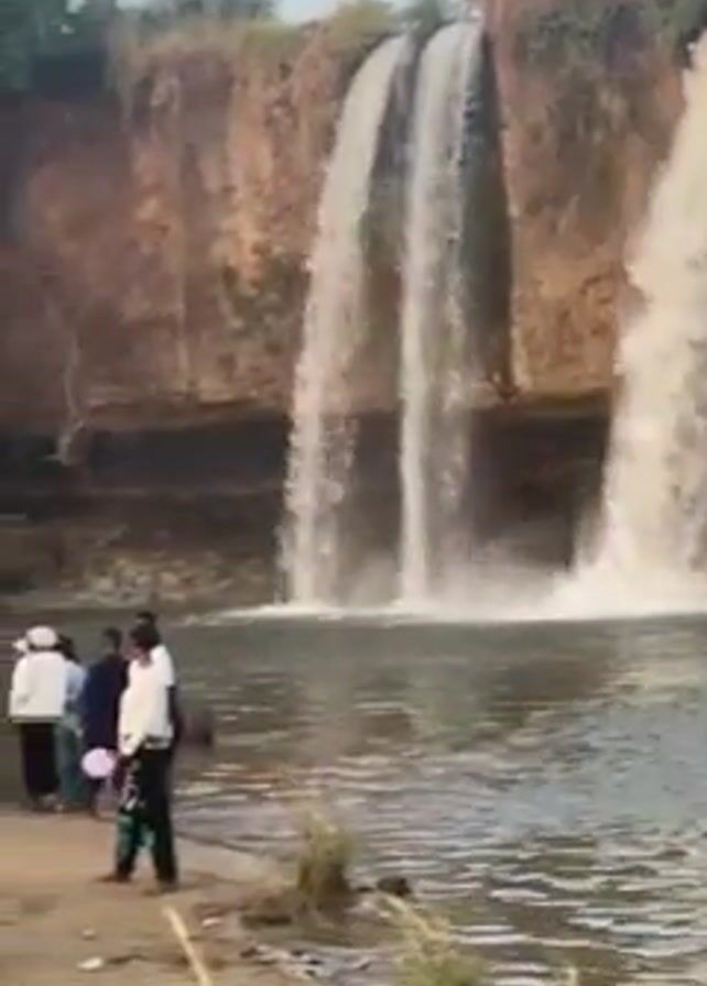 waterfall with three separate streams of water falling into a pool. The waterfall is surrounded by a rocky cliff covered in vegetation. The water in the pool is calm and reflects the sky and surrounding scenery. In the foreground, there is a sandy area with some sparse vegetation. There are several people near the pool of water. Some of them are standing and talking, while one person is crouching down near the edge of the water. The overall tone of the video is peaceful and serene.