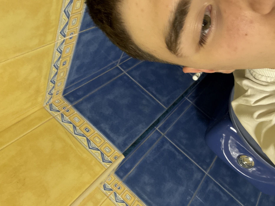 The image depicts a partial overhead view of a person taking a selfie in a restroom located in Provadia, Bulgaria. The subject's right eye, eyebrow, upper cheek, ear, and dark brown hair are visible in the lower right quadrant of the frame. The eye color is light brown or hazel. The person wears a light-colored, possibly beige or off-white, garment, likely a t-shirt or sweatshirt. The restroom walls are tiled, with rectangular yellow tiles on the upper section and square dark blue tiles on the lower section. A decorative border tile, featuring blue and yellow geometric patterns, separates these two tile sections. In the lower-left corner, a dark blue ceramic toilet bowl or urinal is partially visible, featuring a silver flush mechanism. The perspective suggests the camera is positioned above and angled downwards into the fixture.