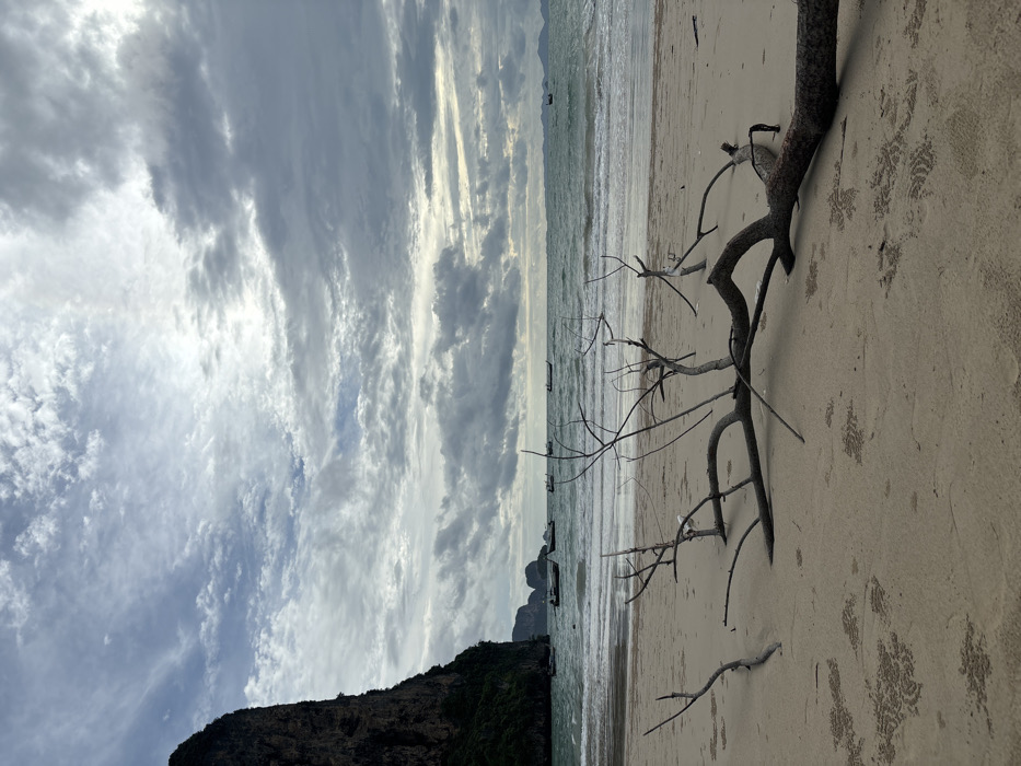 The image depicts a coastal scene in Ao Nang, Thailand. The foreground consists of a light brown sandy beach, exhibiting patterns of small sand balls, likely from crab activity, on the lower left and central areas. A large, dark, gnarled tree branch or piece of driftwood lies horizontally across the mid-foreground, with numerous smaller, bare branches extending upwards and outwards. Additional smaller bare branches are scattered on the sand. The midground features a turquoise-green sea with moderate waves breaking on the shore. Approximately seven longtail boats are visible on the water, positioned at various distances from the beach. To the left, a tall, dark limestone karst cliff, partially covered with green vegetation, rises steeply and extends out of the frame vertically. The horizon reveals several smaller islands or karsts in the distance. The sky is overcast with a mix of grey and white clouds, showing some brighter areas, particularly in the upper left, suggesting diffused daylight. No individuals are visible in the scene.